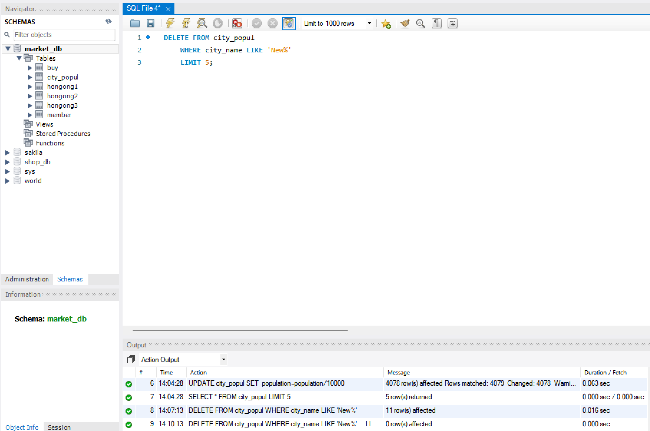 만약 'New' 글자로 시작하는 11건의 도시를 모두 지우는 것이 아니라 'New' 로 시작하는 글자 중 상위 몇 건만 삭제하려면 LIMIT 구문과 함께 사용하면 됨.