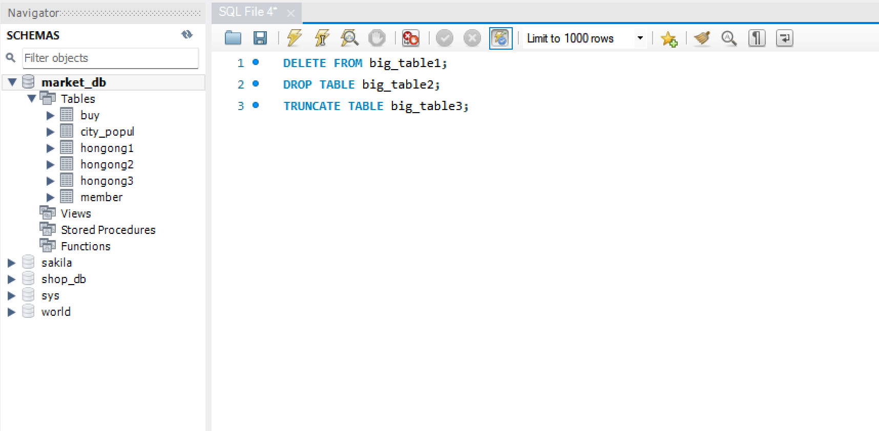 동일한 내용의 대용량 테이블 3개를 DELETE, DROP, TRUNCATE 각각 다른 방법으로 삭제하기