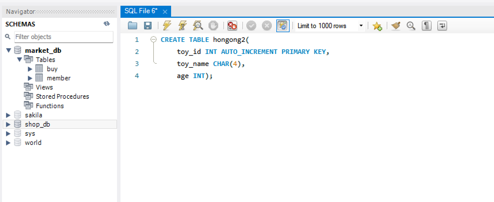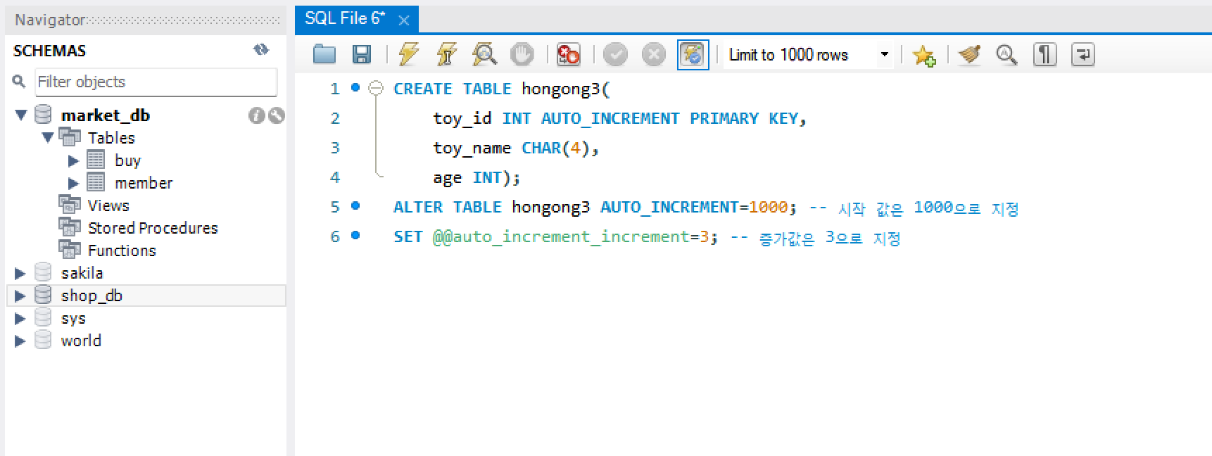 2) AUTO_INCREMENT로 지정하는 열은 PRIMARY KEY로 지정해줘야 함.