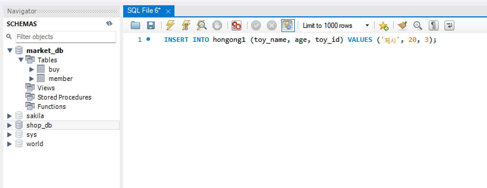 만약, 입력하고 싶지 않은 데이터가 있다면, 테이블 이름 뒤에 입력할 열의 이름을 작성해야 함.