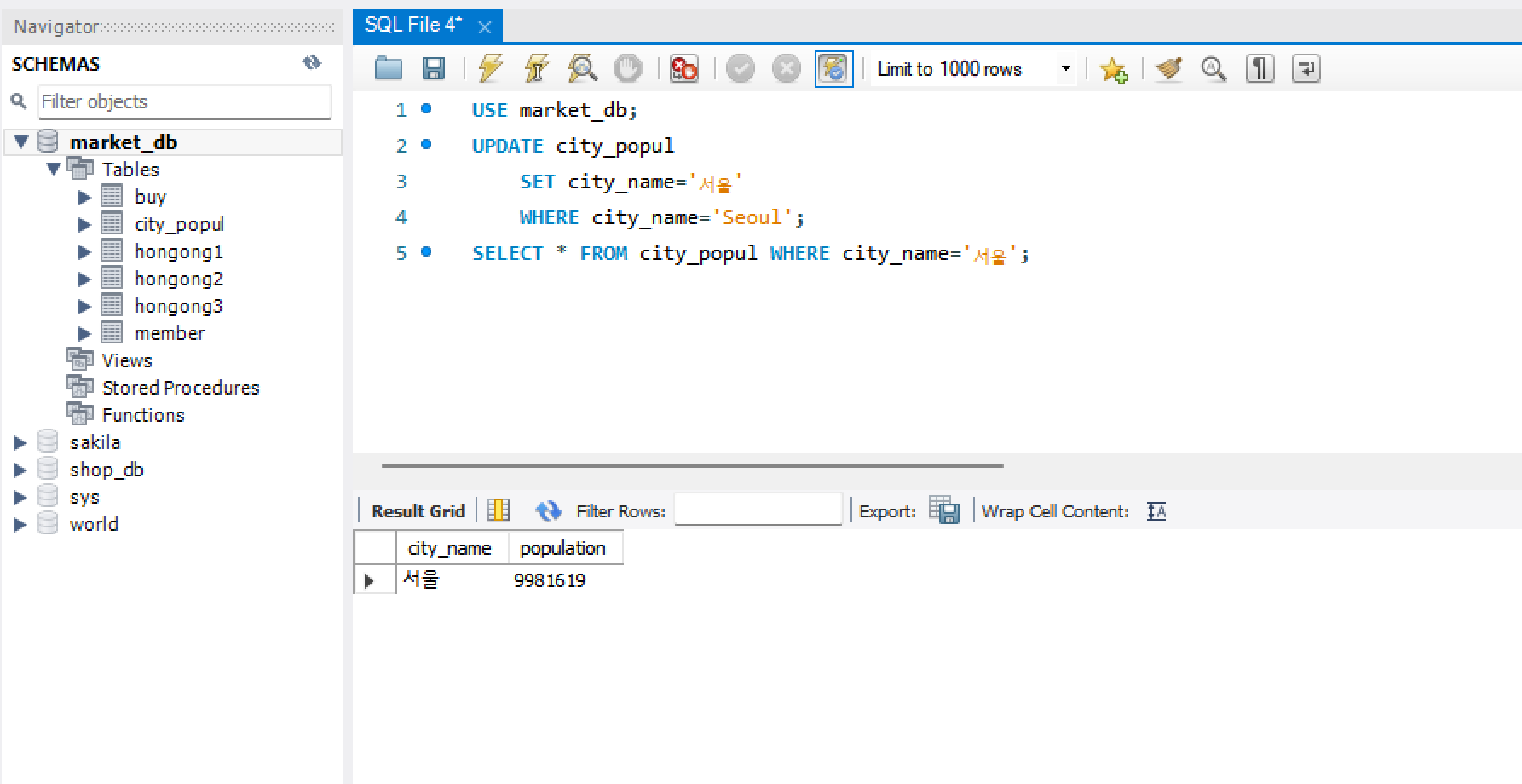 앞에서 생성한 city_popul 테이블의 도시 이름 중에서 Seoul을 서울로 변경하기