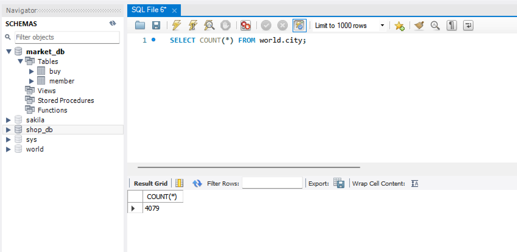 world 데이터베이스의 city 테이블의 개수를 조회함.