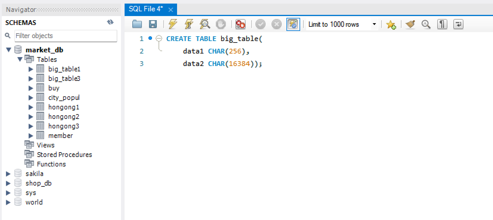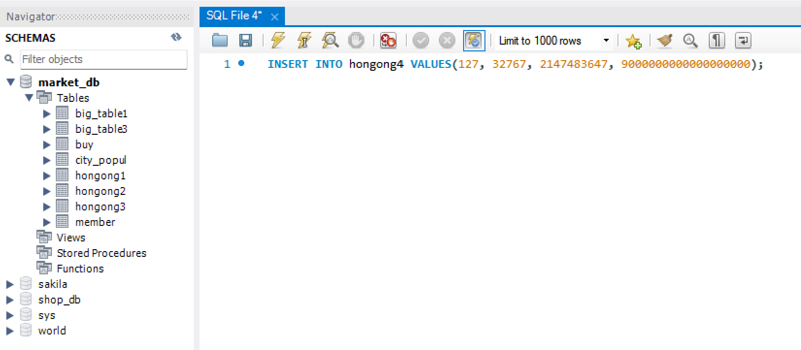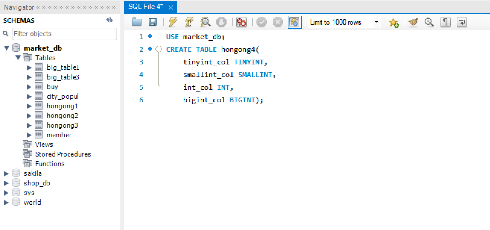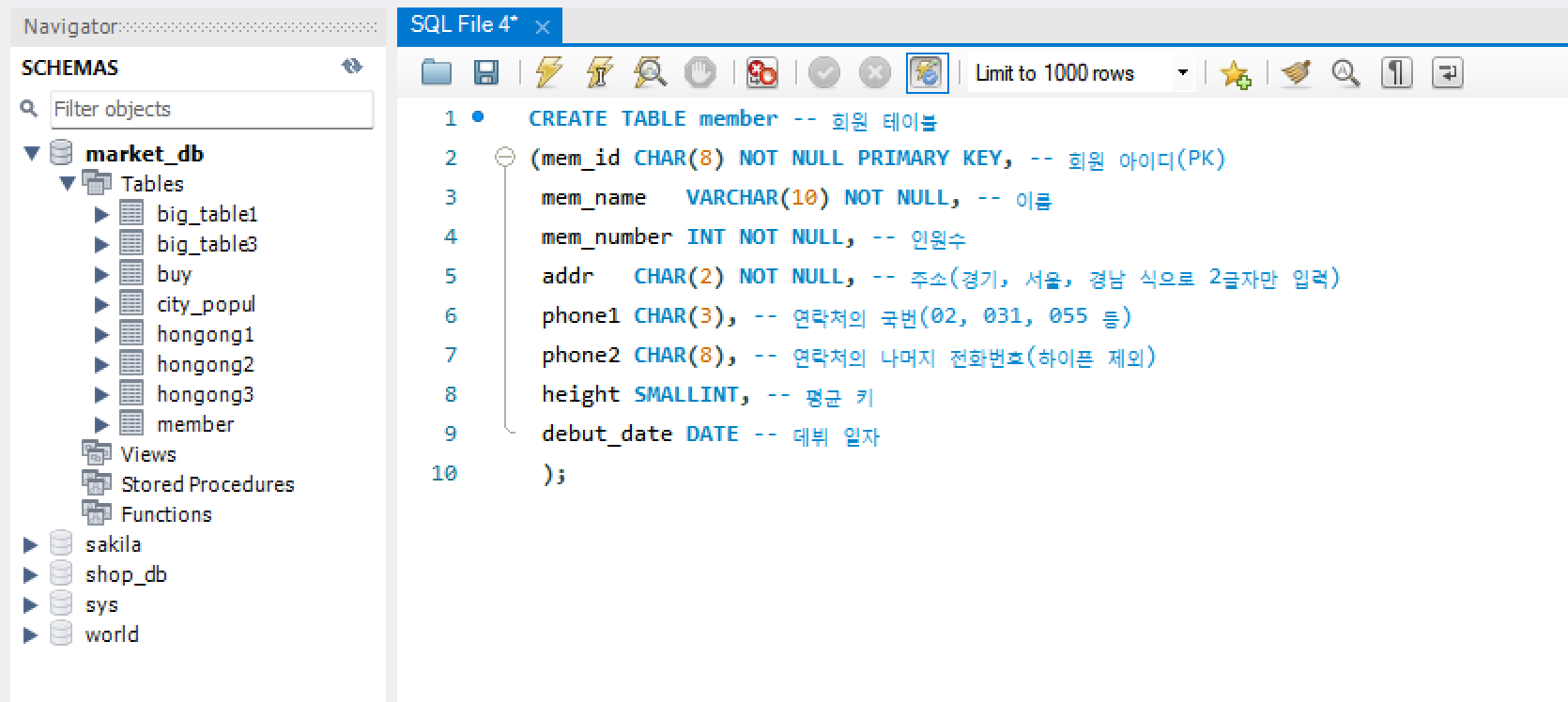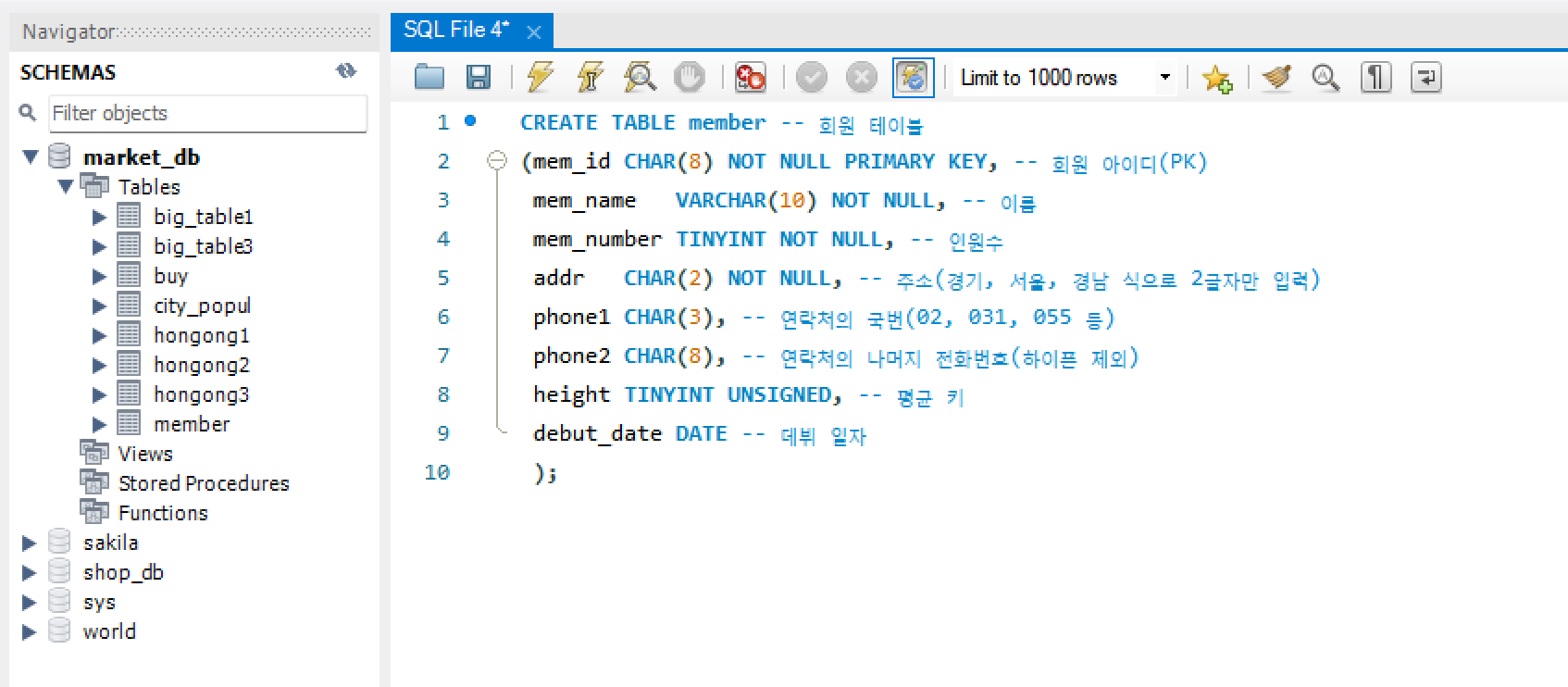 2) 인원수(mem_num) 열은 INT로 지정해서 -21억 ~ +21억까지 저장할 수 있음.