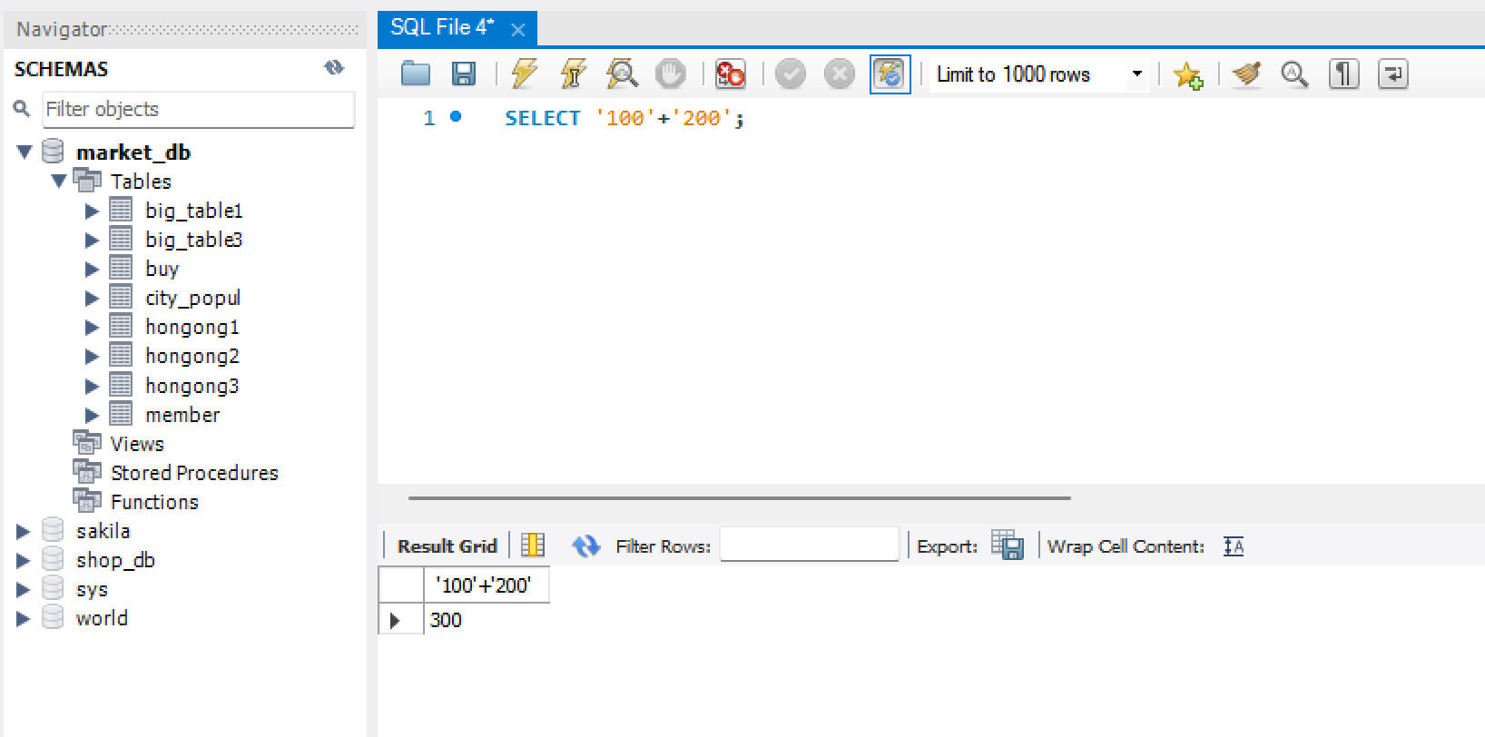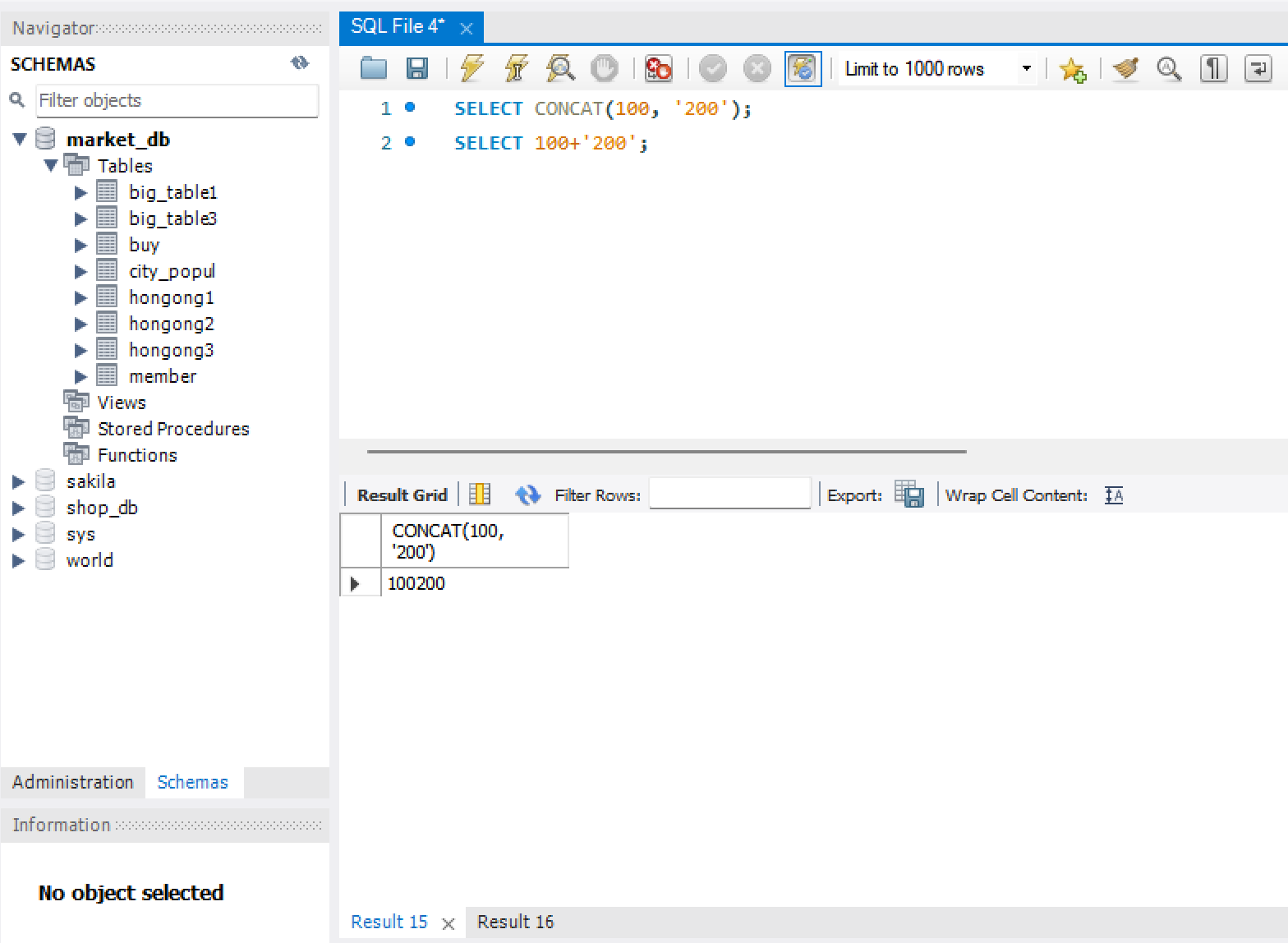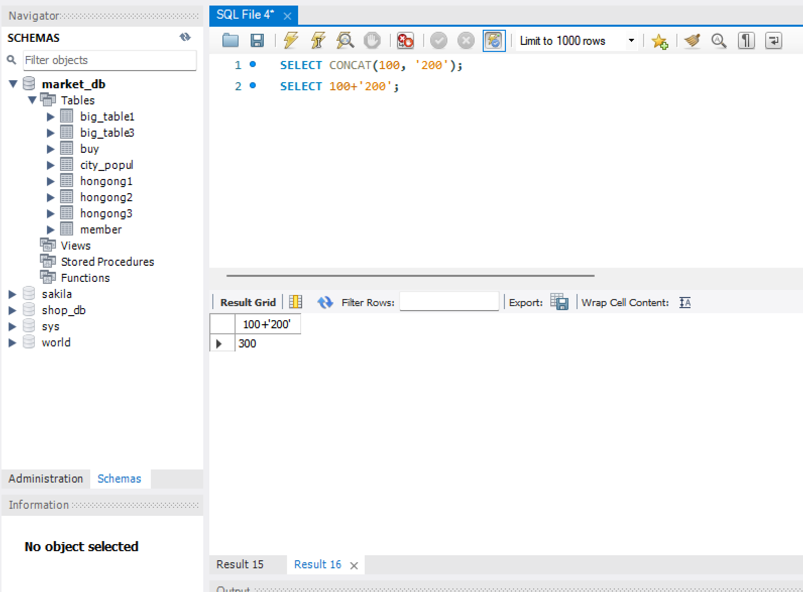2) CONCAT() 함수를 사용하지 않으면, 문자가 숫자로 변환되어 계산됨.