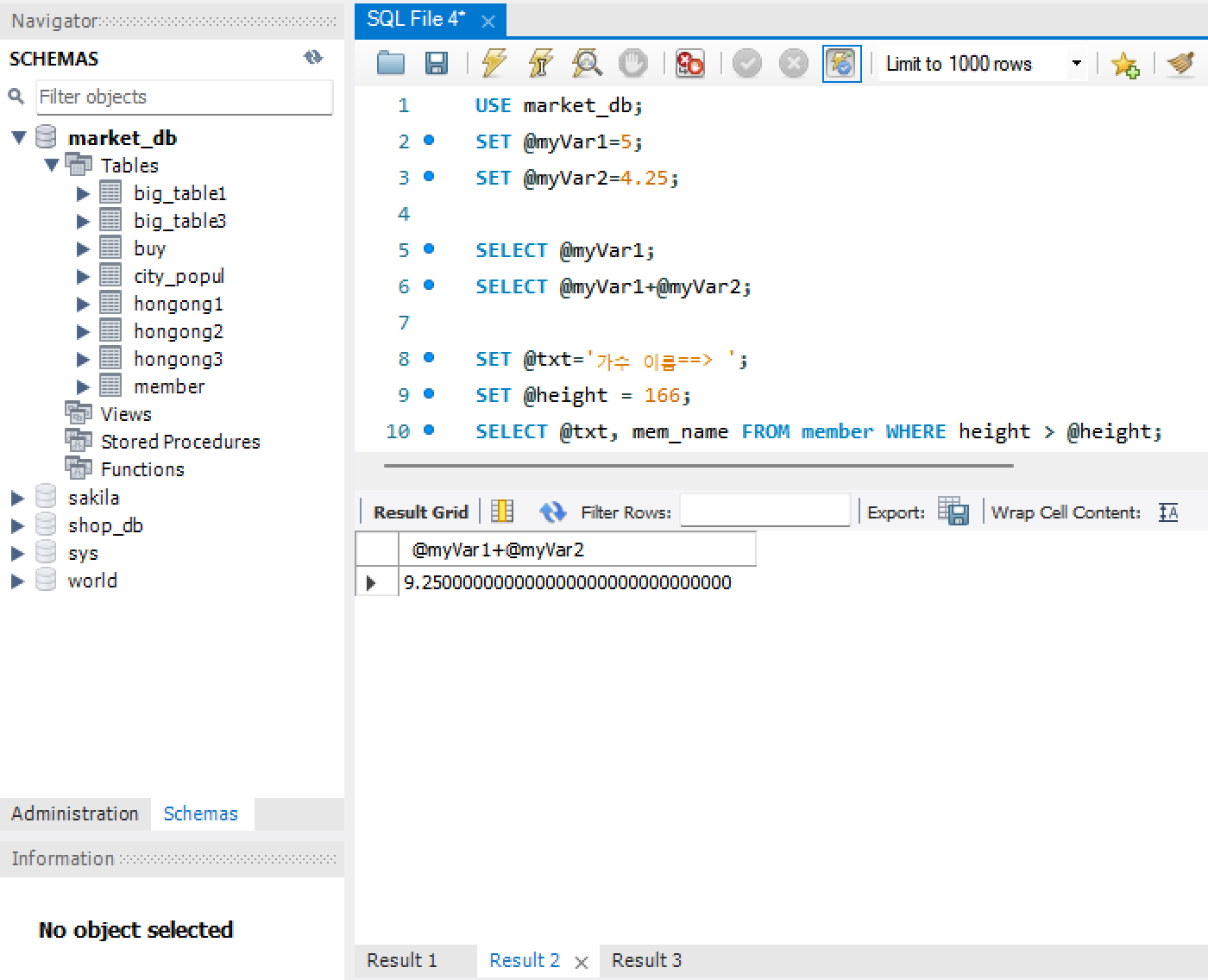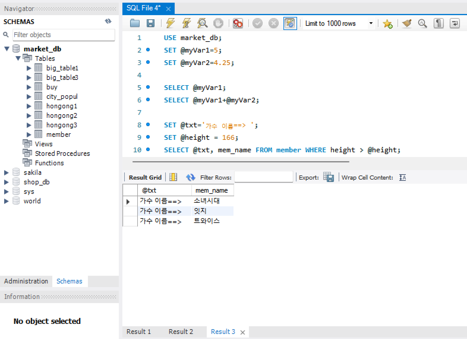 1) 변수는 MySQL 워크벤치를 재시작할 때까지는 유지되지만, 종료하면 없어짐.