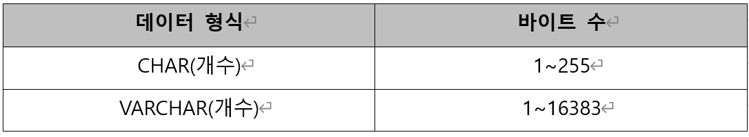 문자형인 CHAR은 최대 255자까지, VARCHAR은 최대 16383자까지 지정이 가능함.