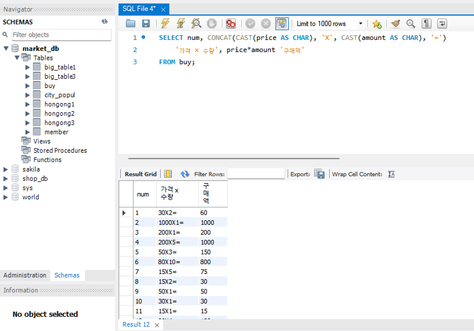 2) CAST() 함수를 통해 정수인 가격과 수량을 문자로 바꿈.