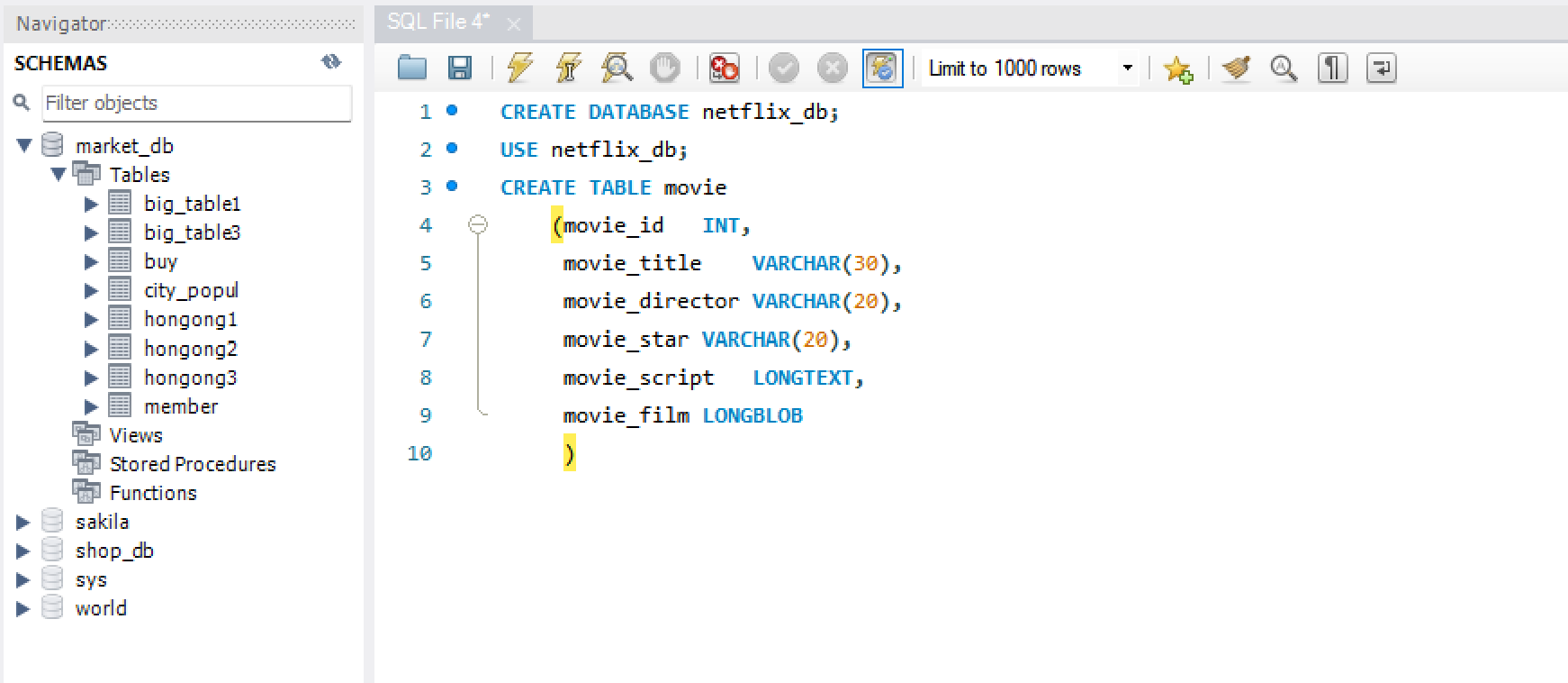 1) 자막(movie_script) 열은 LONGTEXT, 동영상(movie_film) 열은 LONGBLOB로 설정해야 대용량은 텍스트와 이진 데이터를 저장할 수 있음.