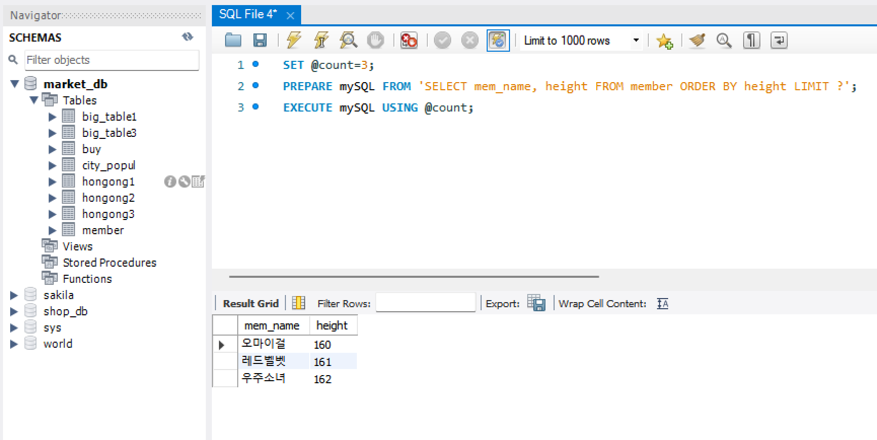 4) EXECUTE로 mySQL에 저장된 SELECT 문을 실행할 때, USING으로 물음표에 @count 변수의 값을 대입하는 것임.