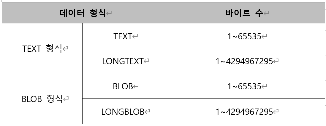 1) TEXT로 지정하면, 최대 65535자까지, LONGTEXT로 지정하면 최대 약 42억자까지 저장됨.