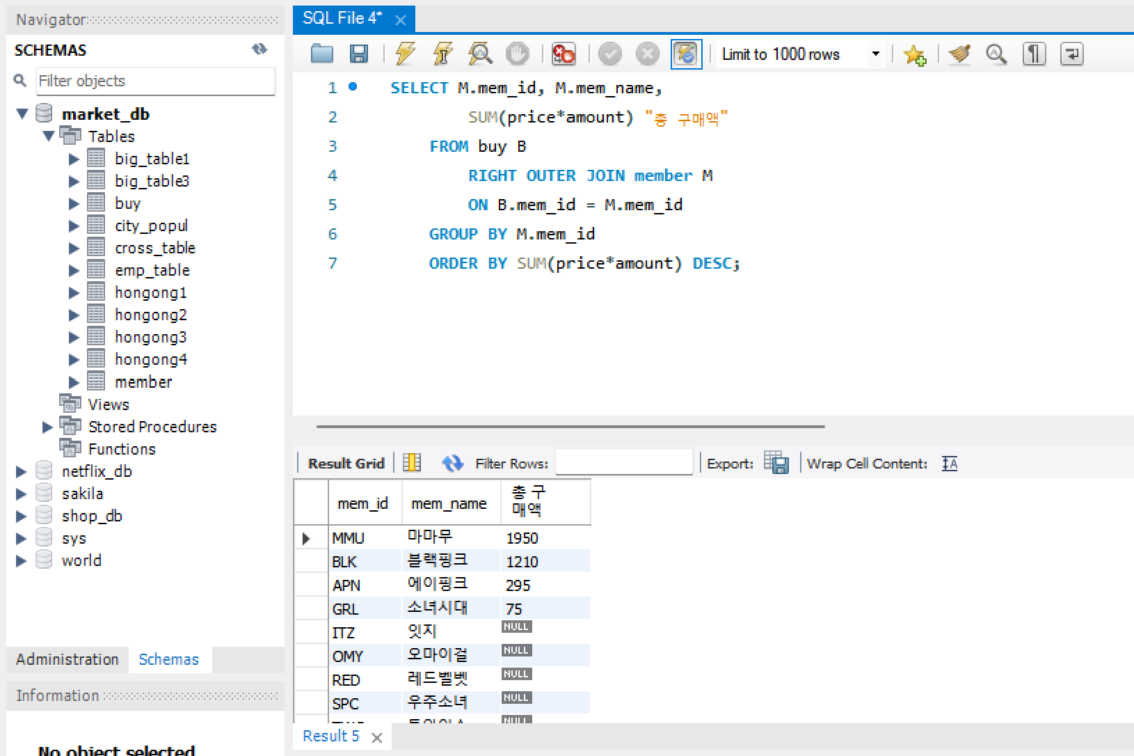 2) 구매한 적이 없어도 회원 테이블에 있는 회원은 모두 출력해야 하므로 INNER JOIN을 RIGHT OUTER JOIN으로 변경함.