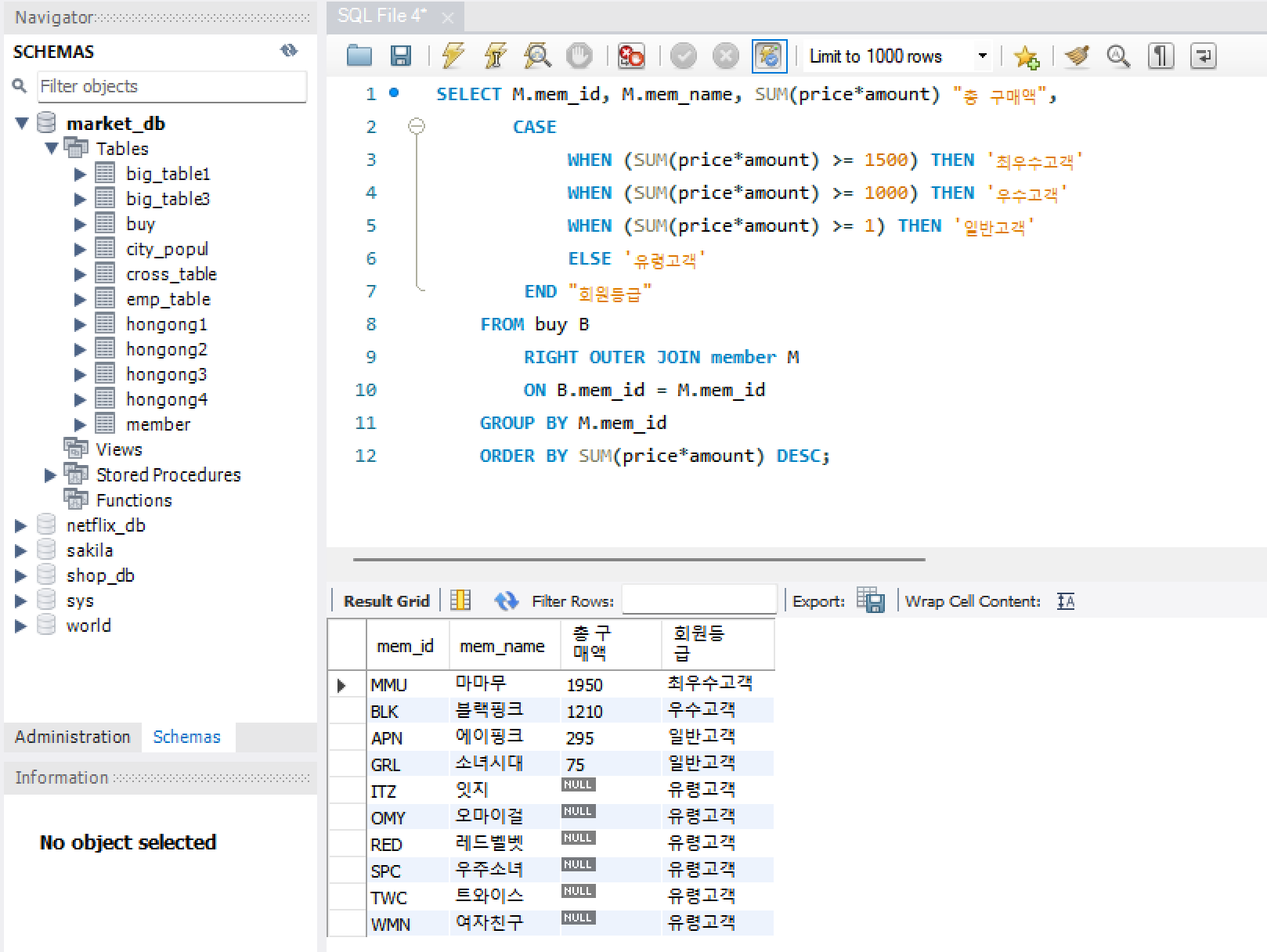 회원들의 총 구매액을 계산하여 회원의 등급을 4단계로 나누는 예제