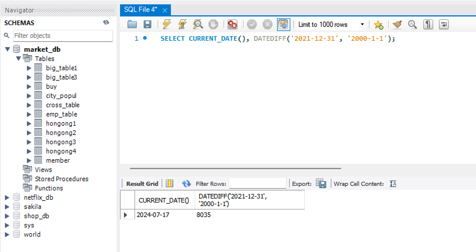 4) DATEDIFF() 함수로 데뷔 일자부터 현재 날짜까지 일수를 days에 저장함.