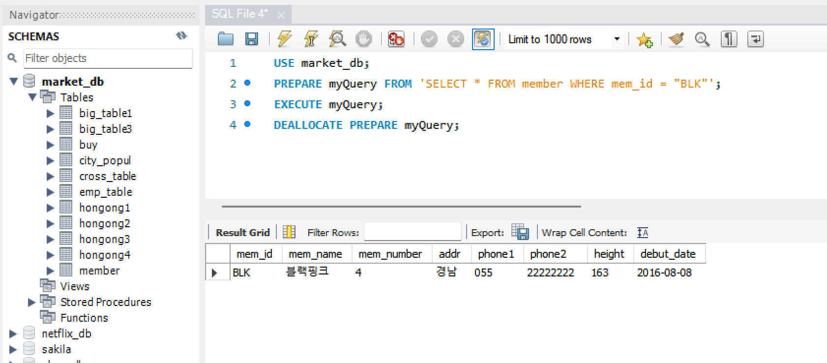 1) PREPARE 문에서는 SELECT * FROM member WHERE mem_id = "BLK"를 바로 실행하지 않고 myQuery에 입력해놓음.