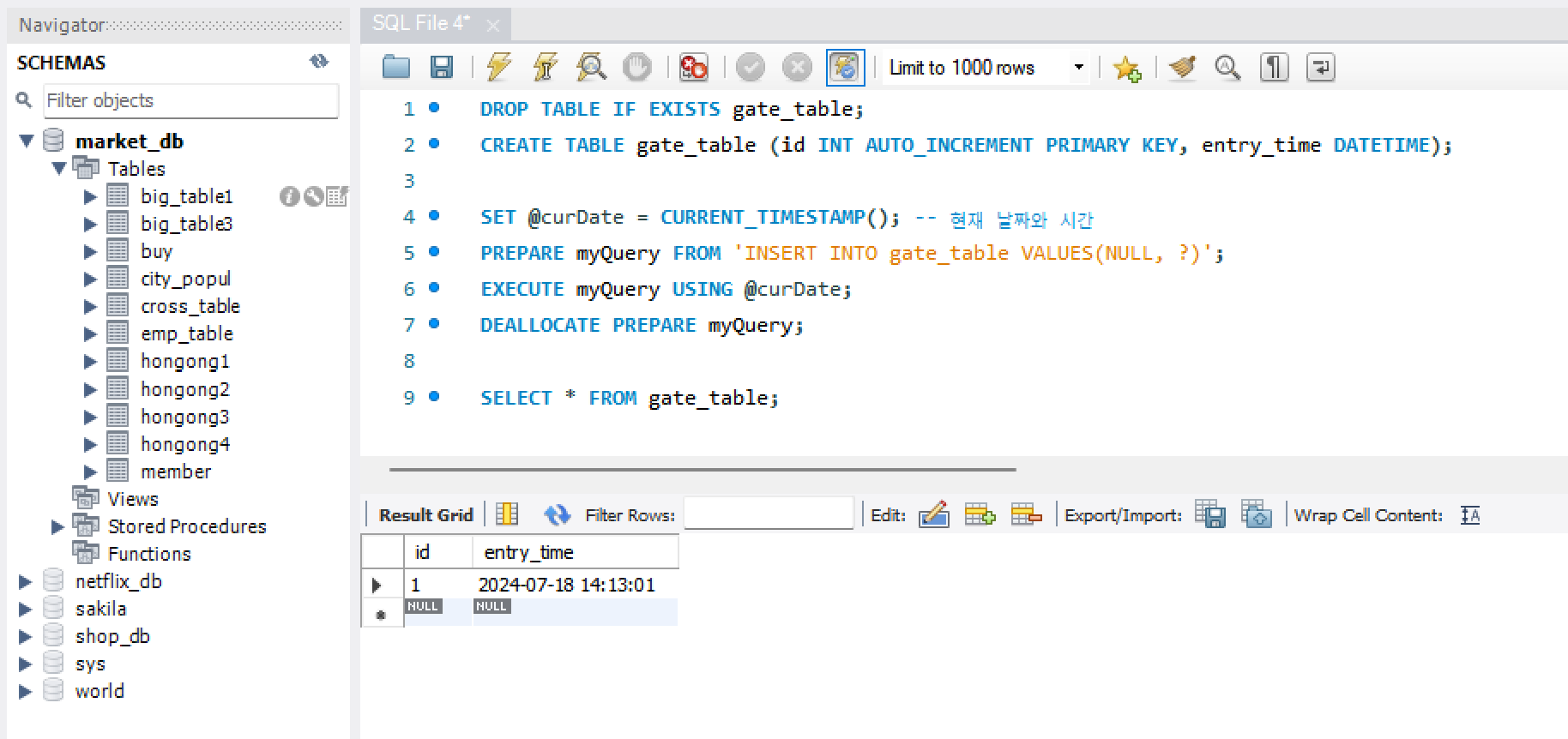 4) USING 문으로 앞에서 준비한 @curDate 변수를 넣은 후에 실행됨. 결국 이 SQL을 실행한 시점의 날짜와 시간이 입력됨.
