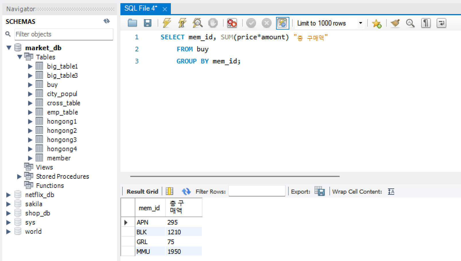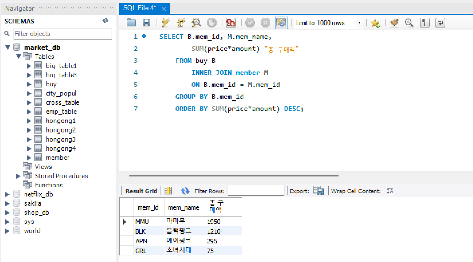 ORDER BY를 사용해서 총 구매액이 많은 순서로 정렬하기