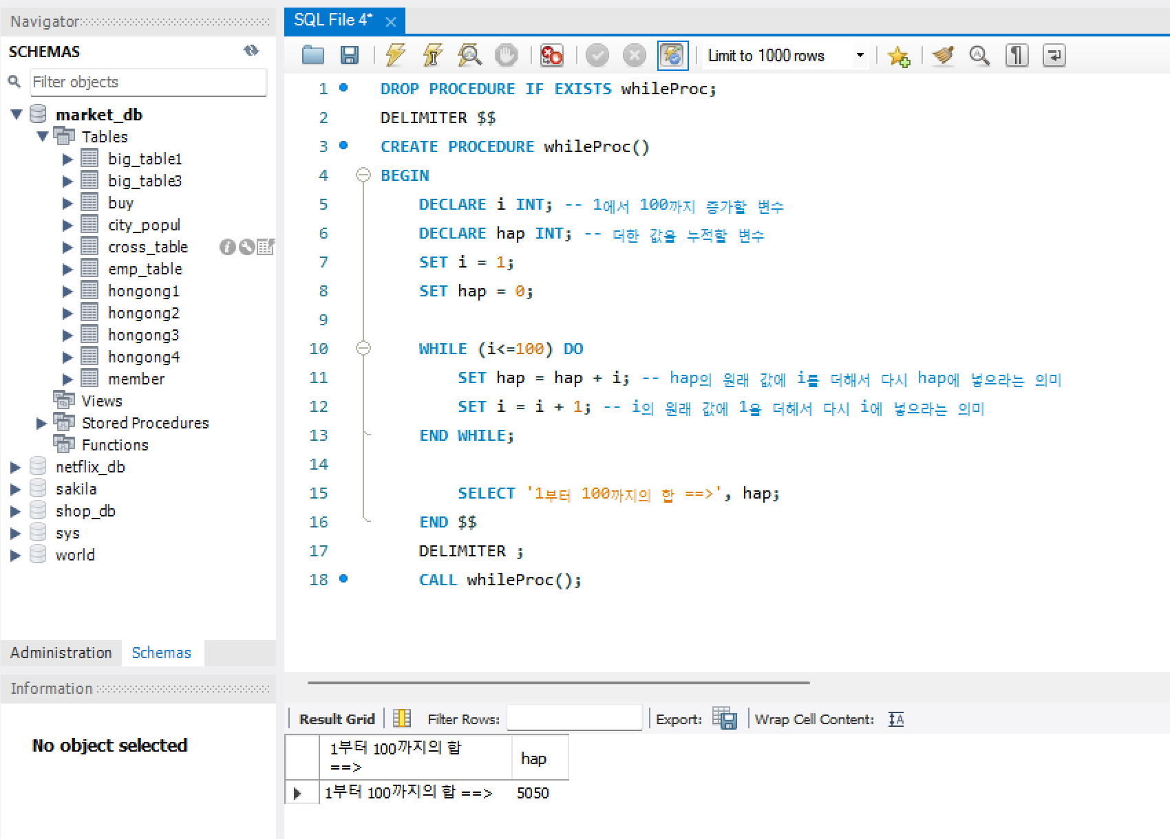 1부터 100까지의 값을 모두 더하는 WHILE 문