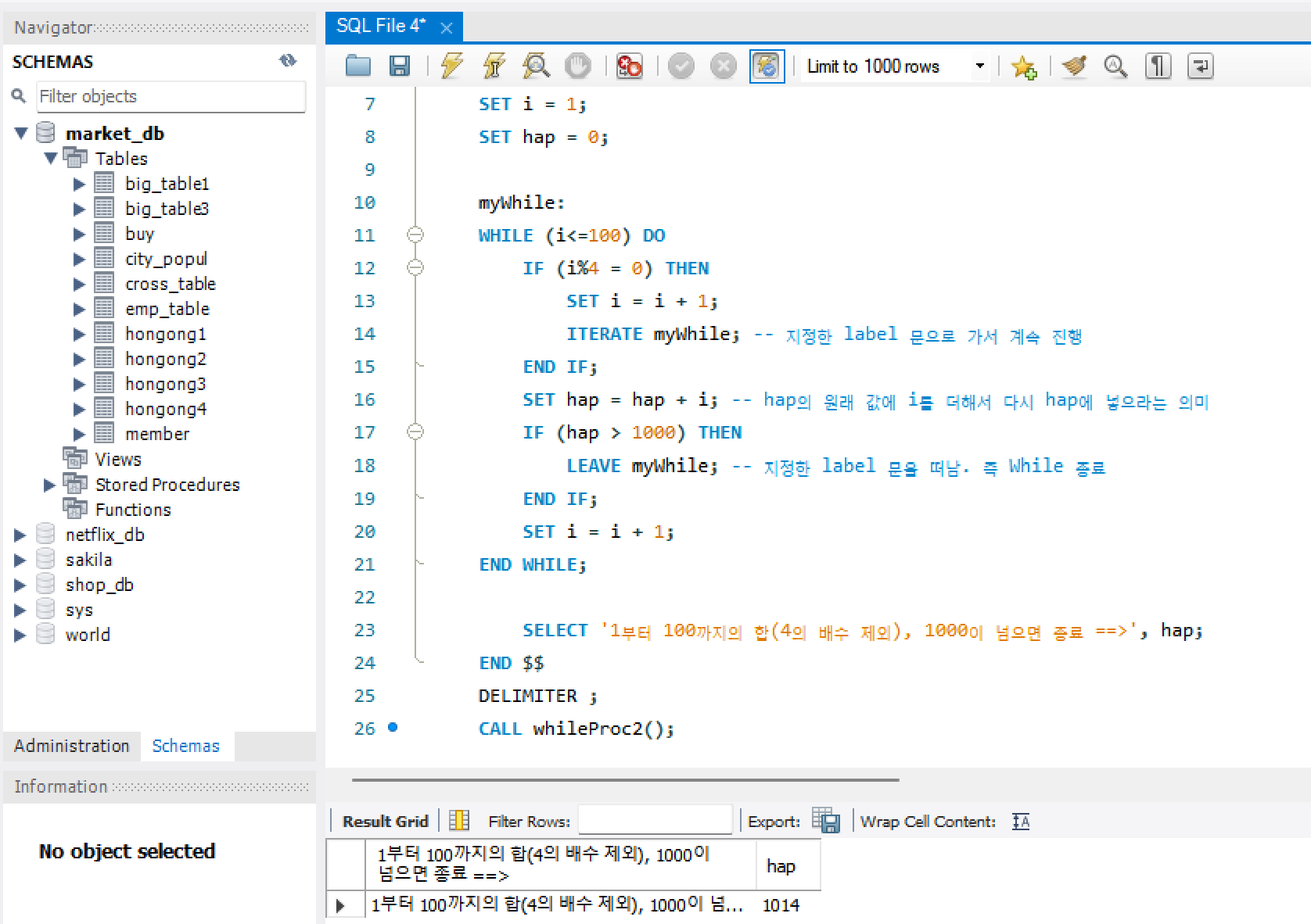 1) WHILE 문을 myWhile 이라는 레이블로 지정함.