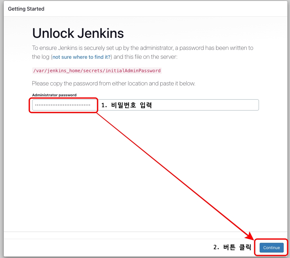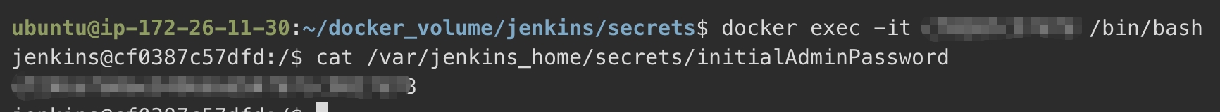 docker exec {컨테이너 정보} cat /var/jenkins_home/secrets/initialAdminPassword