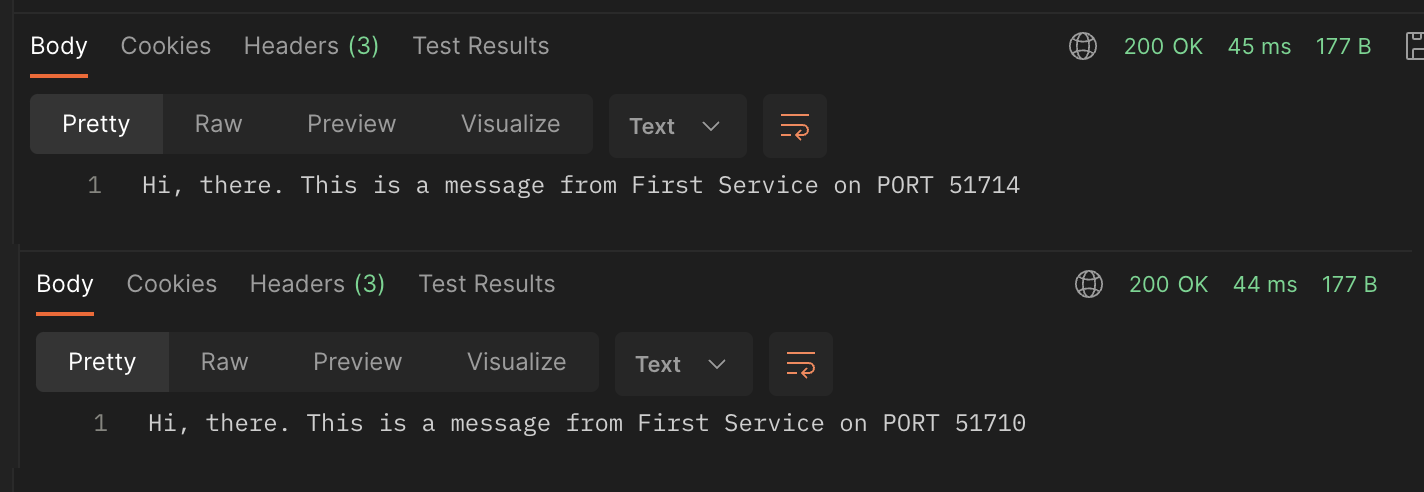 이렇게 지정한 후 원하는 인스턴스가 늘어났다고 가정한 뒤 호출을 하면 다음과 같이 다른 포트의 서버가 호출되서 동작하는 것을 확인할 수 있습니다.