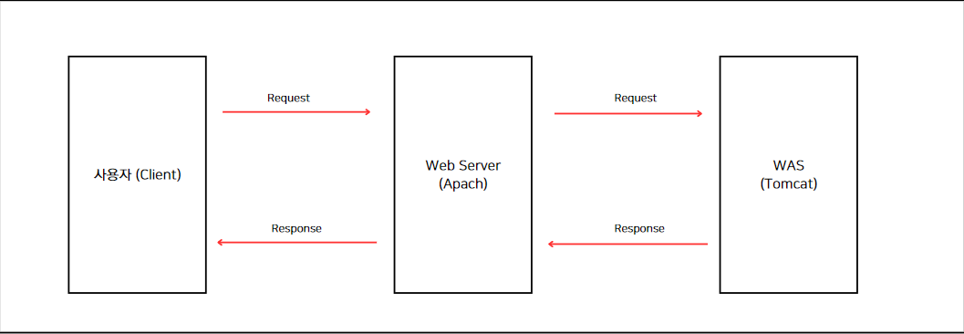 어플리케이션에 Web Server만 존재한다면 많은 문제가 발생한다. 그리하여 WAS를 함께 구성해주는 방식을 사용한다. Web Server는 별다른 로직이 필요없는 정적 페이지(또는 이미지, 파일 등)를 처리하고, 로직이 필요한 경우 WAS에게 요청을 넘겨 요청에 맞는 로직을 처리하여 결과를 반환한다.
