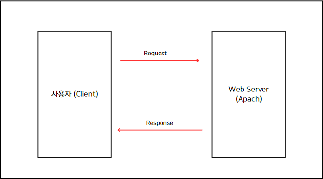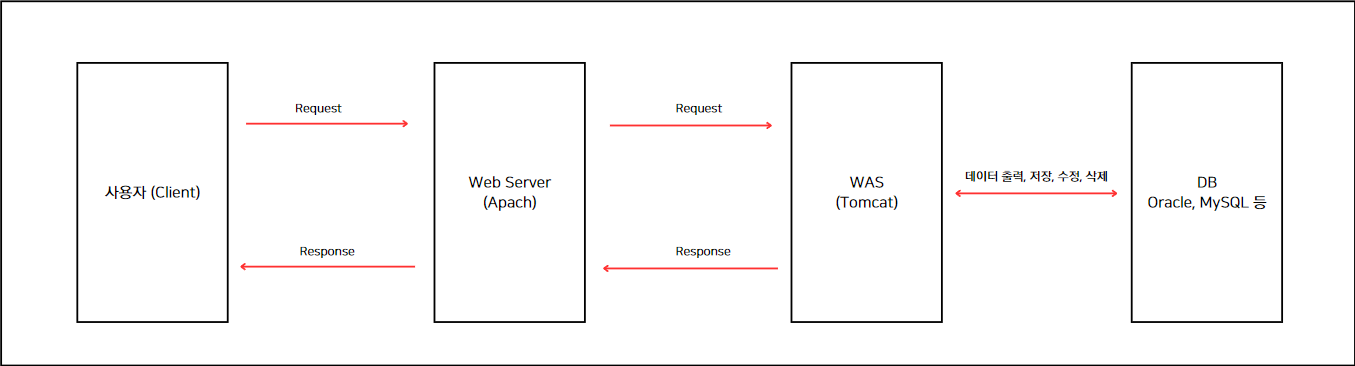Apache는 웹 서버(Web Server) 프로그램이라고 하였다. Web Server 프로그램은 사용자가 요청하면 요청받은 페이지를 보내주는 정적인 방식이다. 이러한 방식은 페이지마다 복잡한 로직을 갖는 자바스크립트로 구성된 페이지를 미리 준비해야한다. 또한, 이런 복잡한 로직을 갖는 페이지를 사용자에게 전송해야 한다. 이러한 문제로, WAS에선 미리 준비되어 있는 페이지를 반환하는 것이 아닌, 사용자의 요청에 따라 로직을 처리하여 만들어진 웹페이지를 전송한다. 이때, 만들어진 웹 페이지는 웹 서버를 통해 사용자에게 전달된다.