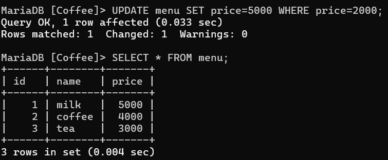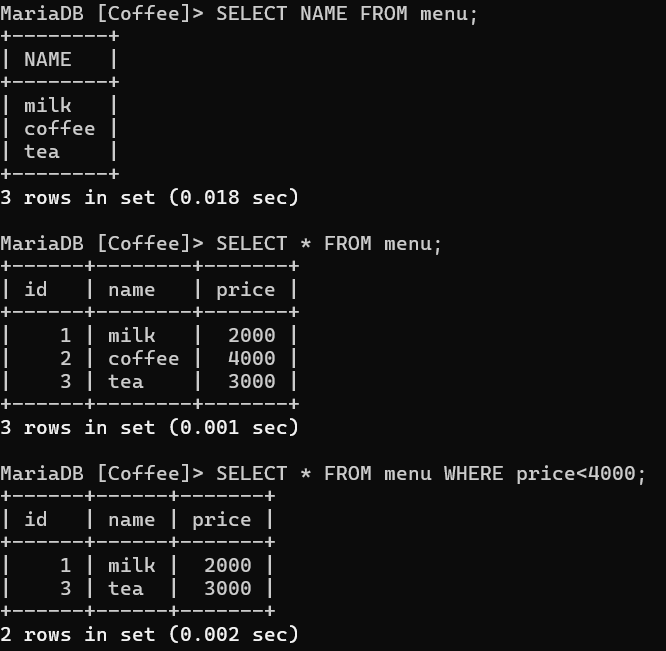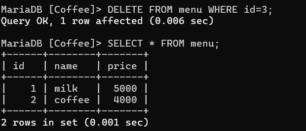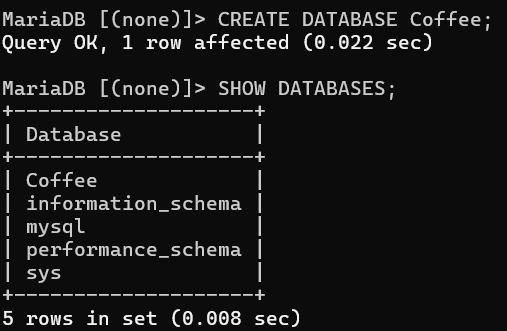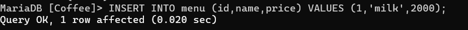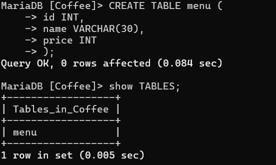 Coffee 라는 database 를 새로 만들었고 이제 이 데이터베이스에 접근하여 여기에 간단하게 테이블을 생성하고 데이터 삽입,조회,삭제 작업을 진행해보자