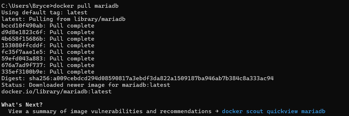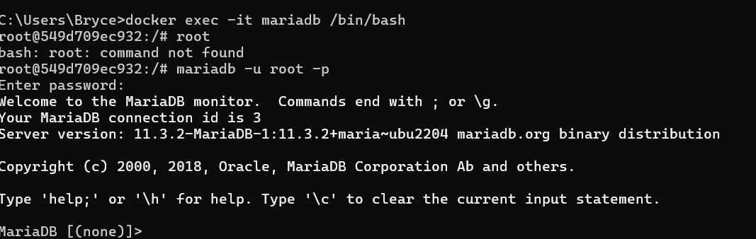 다음 명령어를 통해 도커 컨테이너에 mairadb 설치