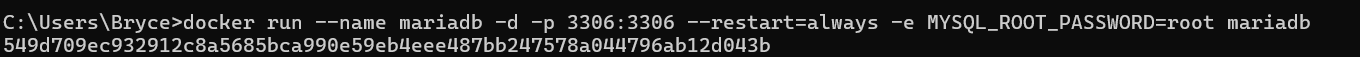 docker run --name mariadb -d -p 3306:3306 --restart=always -e MYSQL_ROOT_PASSWORD=root mariadb