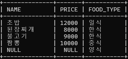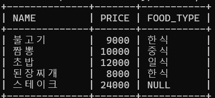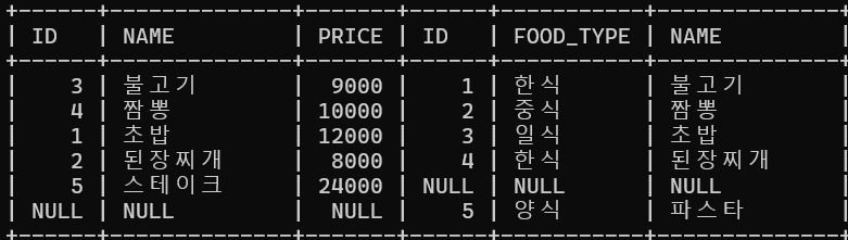 예시) 음식 이름, 가격, 종류를 출력하라. 단, 음식 가격이 책정되지 않은 음식도 출력되게하라