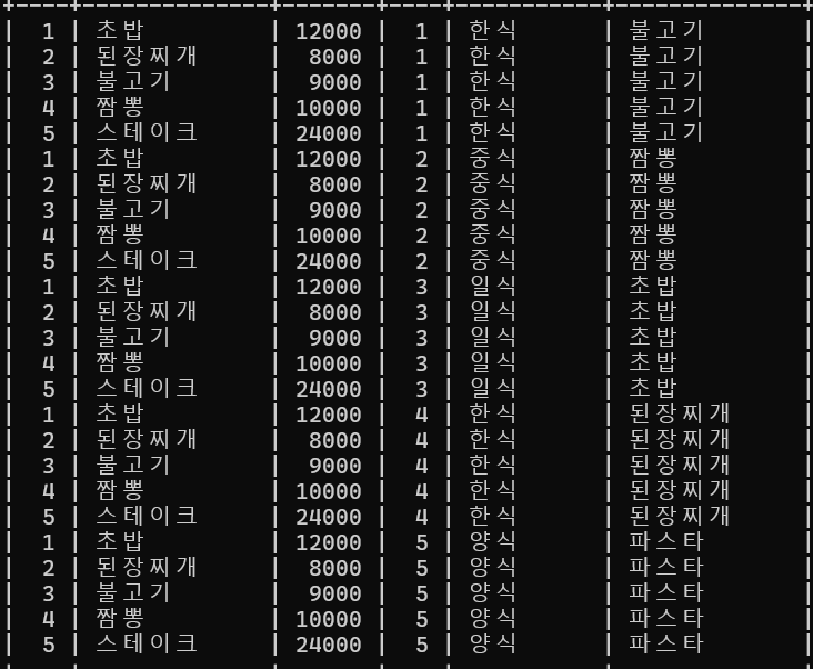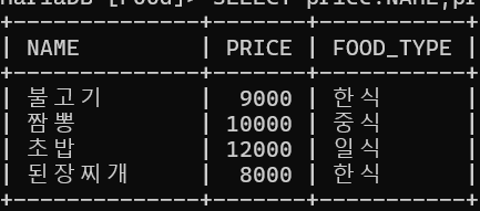 예시) 음식 이름, 가격, 음식 종류를 출력하라
