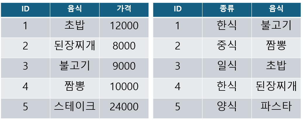 join을 직접 수행하기 위해 다음과 같이 간단한 테이블 2개를 생성했다