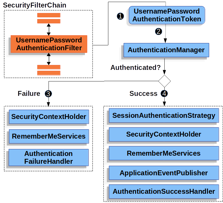UsernamePasswordAuthenticationFilter가 UsernamePasswordAuthenticationToken를 생성한다UsernamePasswordAuthenticationToken의 타입은 Authentication이다HttpServletRequest에서 추출한 정보이다UsernamePasswordAuthenticationToken는 AuthenticationManager로 전달되어 인증을 위임한다SecurityContextHolder가 비워짐RememberMeServices.loginFail이 호출AuthenticationFailureHandler이 호출SessionAuthenticationStrategy에 새로운 로그인 등록SecurityContextPersistenceFilter이 SecurityContextHolder에 등록RememberMeServices.loginSuccess이 호출ApplicationEventPublisher가 InteractiveAuthenticationSuccessEvent를 등록AuthenticationSuccessHandler이 호출SimpleUrlAuthenticationSuccessHandler이며, 로그인시 ExceptionTranslationFilter에 저장된 페이지로 리다이렉트기본 로그인 페이지로 가기위해서 다음 코드를 사용 가능하다