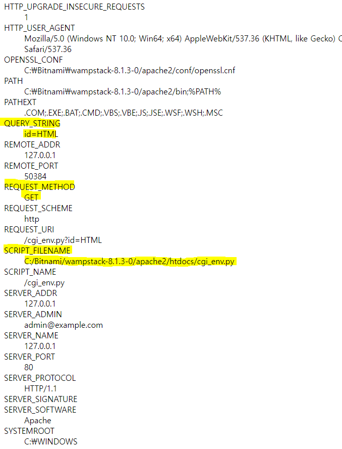 environ 파라미터에 저장되어 있는 'CONTENT_TYPE', 'QUERY_STRING'.. 등의 정보를 어디서 얻는지 모르겠다 했었는데, 이고잉 센세가 알려주신 cgi.test()로 완전히 해결되었다.