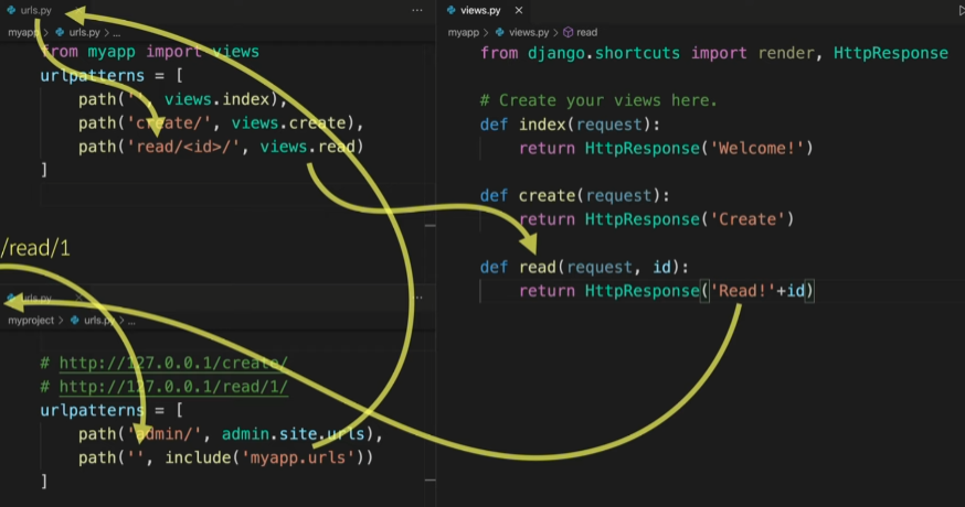 그 다음, 요청자가 기본 경로를 요청한 경우, include()구문에 의해 특정 urlconf를 찾아가고, 거기서 url pattern을 찾는다. 찾으면, 해당 url에 대해 어떻게 반응을 할지, path의 두번째 파라미터를 보고, views로 가서, 지정된 함수를 수행한다.