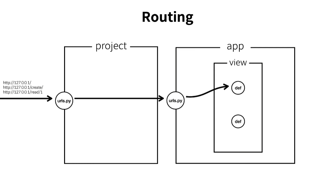 urls.py 가 가장 큰 틀의 라우팅을 하고, 적당한 앱으로 위임을 해주면, view 안에 있는 특정 함수로 위임을 해서 해당 작업을 처리를 한다.