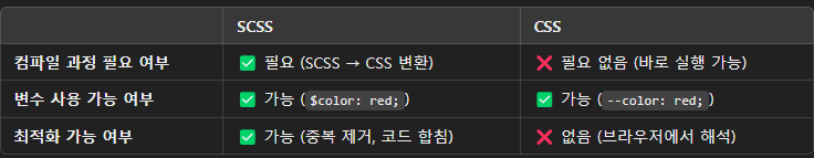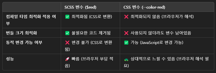 ✔ CSS 변수를 남발하면 성능이 저하될 수 있으므로, 필요한 경우에만 사용하고 기본적으로는 SCSS 변수를 사용하는 것이 가장 최적화된 방식입니다.