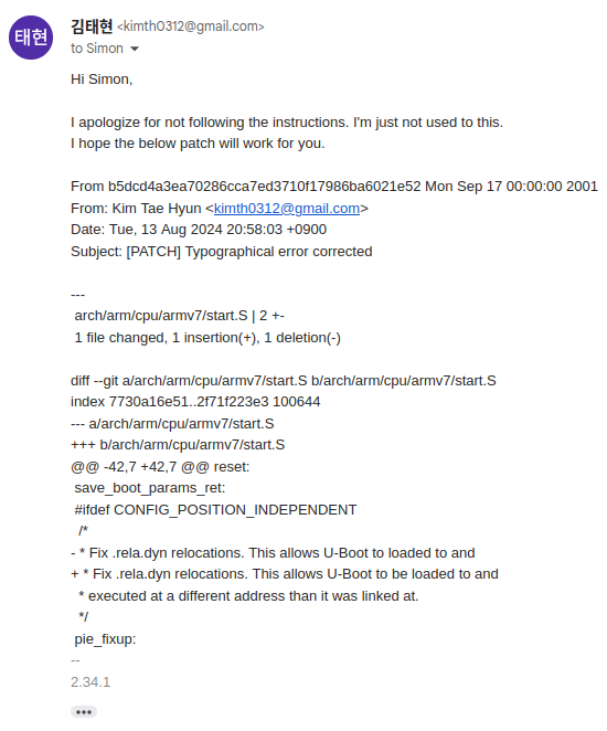 주말에 start.S 코드를 읽던 도중 오탈자를 발견하게 되었고 그 길로 곧장 U-Boot의 Contributor에게 연락을 하고 싶어졌다. 오픈 소스를 분석하는 것도 처음이고 Contribution을 만드는 것은 더더욱 처음이었기에 어떻게 해야 하는지 모르겠어서 일단 README 파일을 무작정 읽었다. 그러다가 아래 문장을 읽게 되었다.
