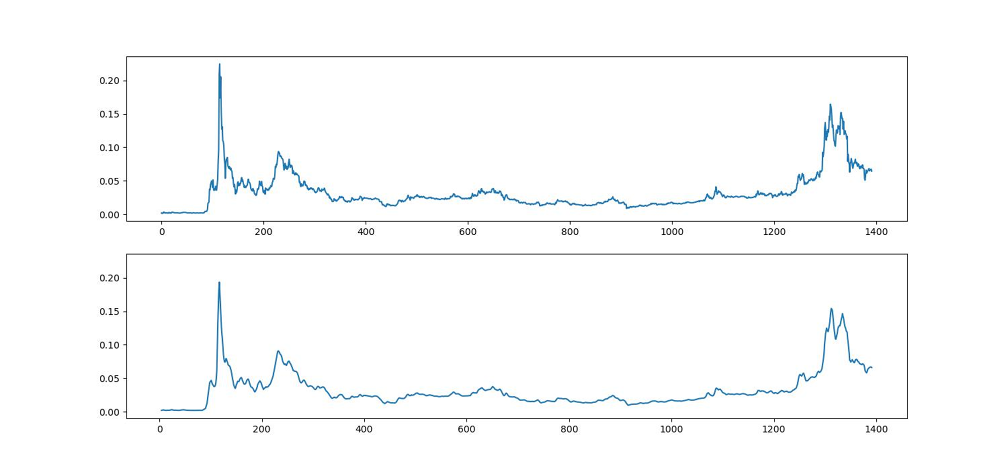 물론 의 값이 보다 배 이상 크다면 변화량이 오히려 커지는 경우도 존재하겠지만, 그 값이 상쇄되기 위해서는 번 더 이동평균을 계산해야하므로 데이터의 변동성이 더 작아지는 게 맞습니다.