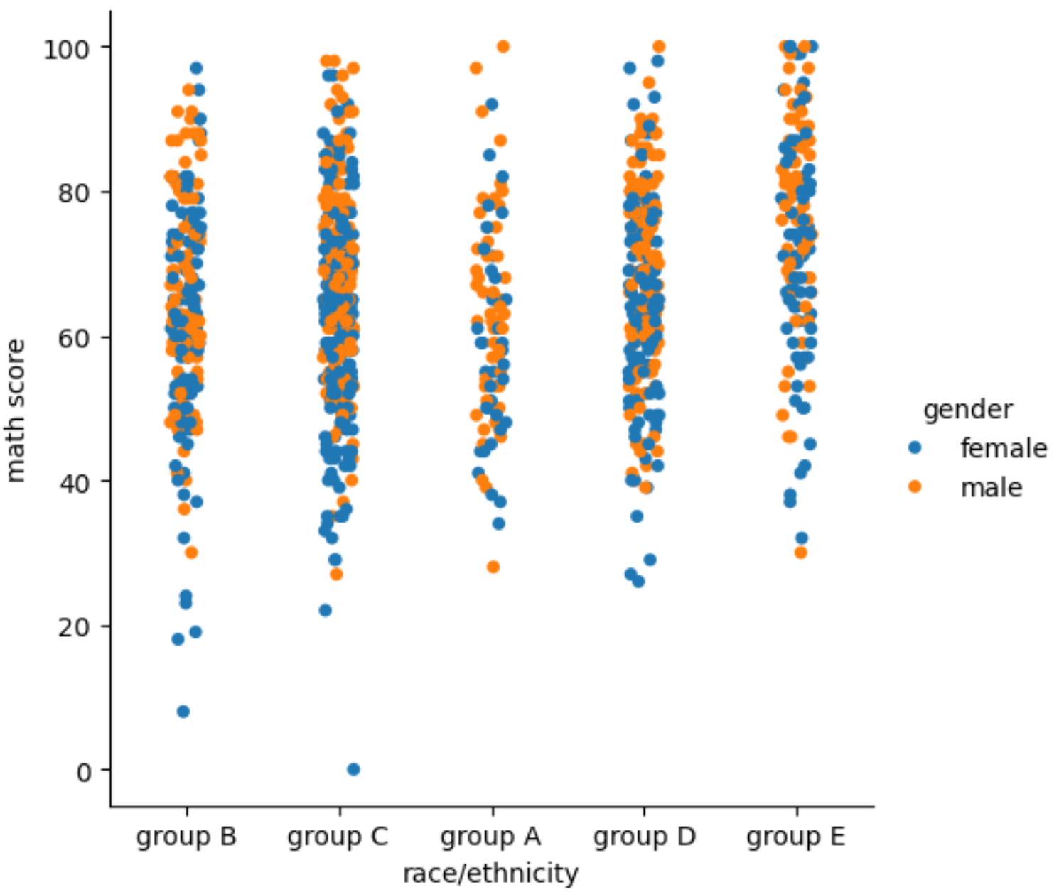 displot은 분포(distribution)를 잘 보여줄 수 있는 plot입니다. 보이는 것처럼 약간 전체적인 수학 성적의 분포가 어떻게 되는지 한 눈에 파악할 수 있습니다.