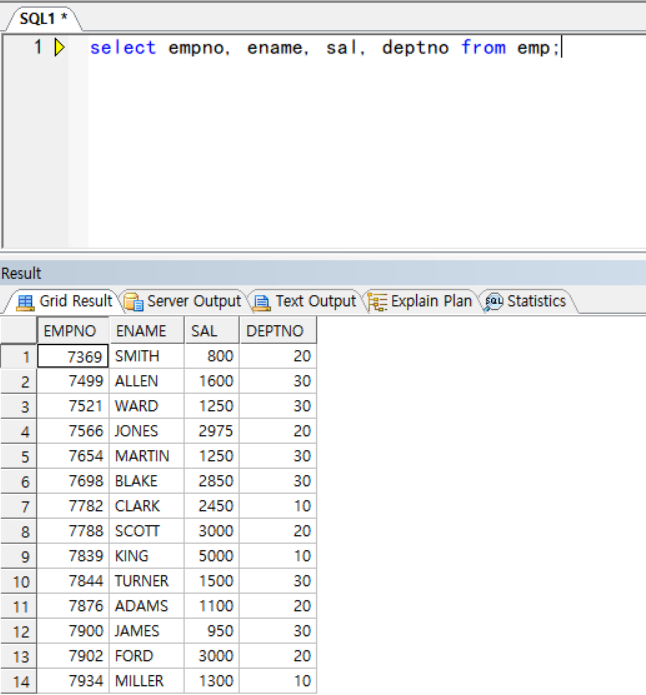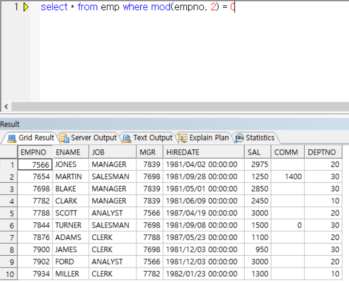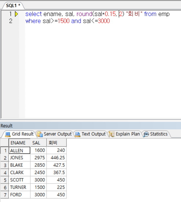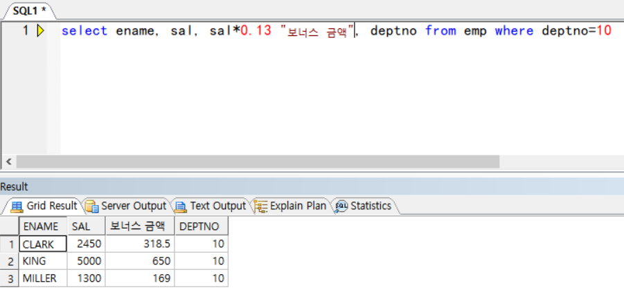 select ename, sal, sal*0.13 "보너스 금액", deptno from emp where deptno=10