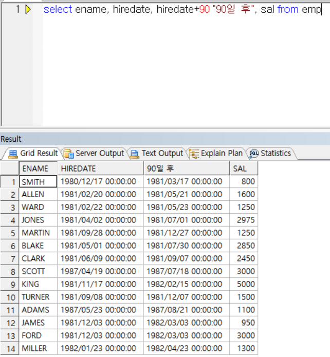 select ename, hiredate, hiredate+90 "90일 후", sal from emp