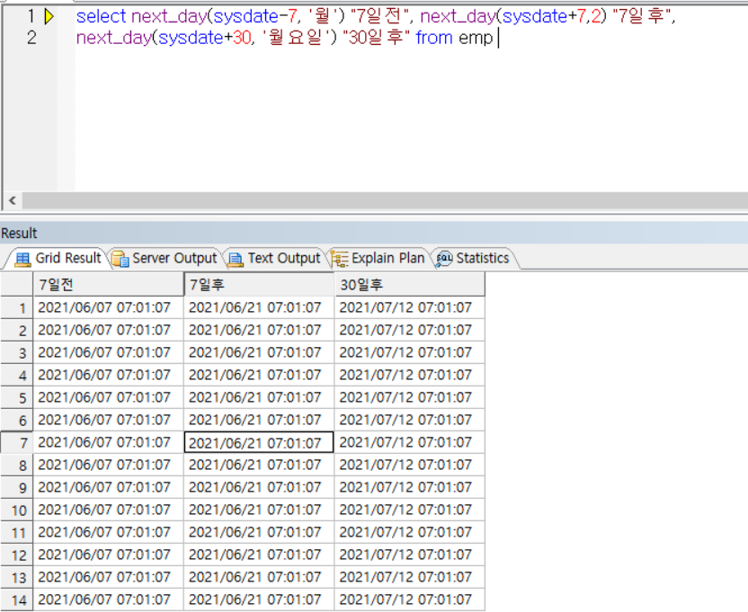 select next_day(sysdate-7, '월') "7일전", next_day(sysdate+7,2) "7일후",