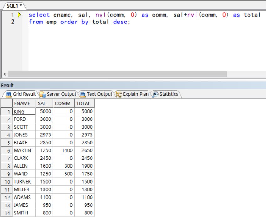 select ename, sal, nvl(comm, 0) as comm, sal+nvl(comm, 0) as total from emp order by total desc;