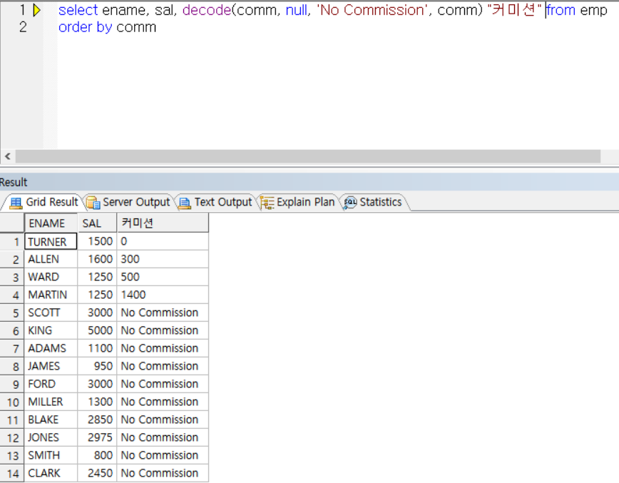 select ename, sal, decode(comm, null, 'No Commission', comm) "커미션" from emp