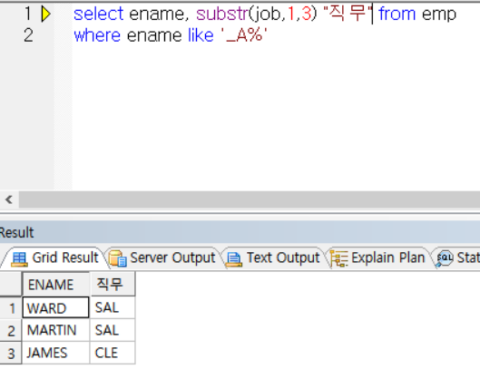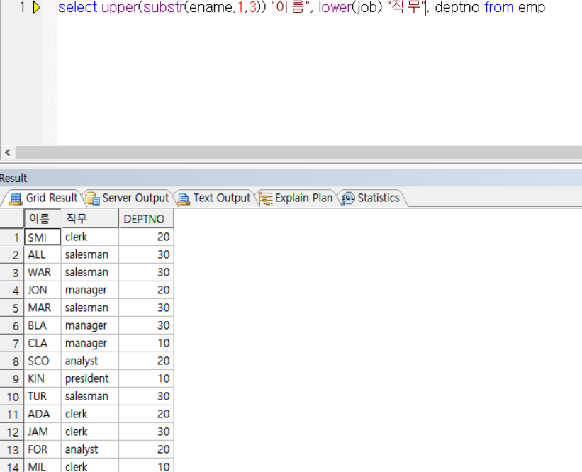 select upper(substr(ename,1,3)) "이름", lower(job) "직무", deptno from emp