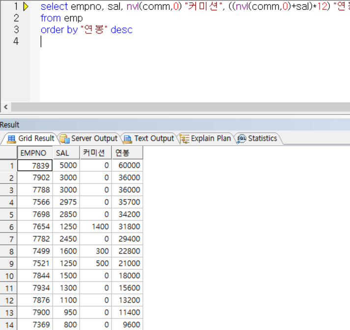 select empno, sal, nvl(comm,0) "커미션", ((nvl(comm,0)+sal)*12) "연봉"
