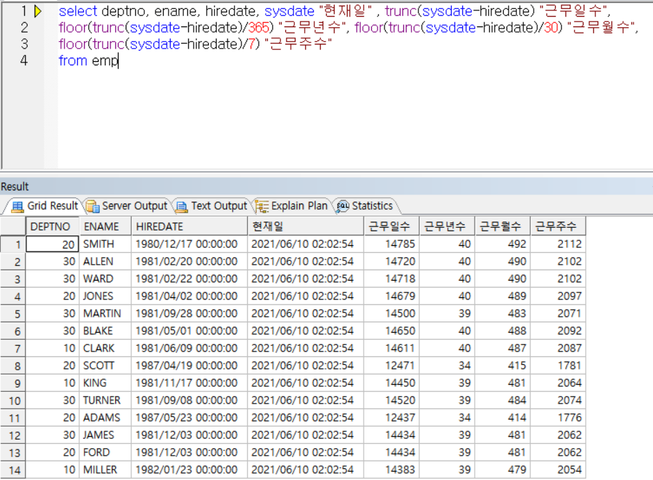 select deptno, ename, hiredate, sysdate "현재일" , trunc(sysdate-hiredate) "근무일수",