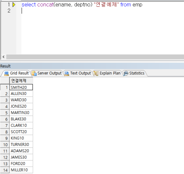 concat(문자열1, 문자열2) concat(문자열1 || 문자열2 || ... || 문자열n) 문자열1||문자열2