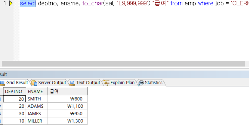 select deptno, ename, to_char(sal, 'L9,999,999') "급여" from emp where job = 'CLERK'